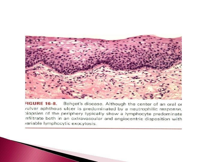 � � � The extracutaneous manifestations are categorized as oral and/or genital aphthae; vasculo-, ocular-, entero-, or neuro- Behcet's disease; renal disease; and arthritis. Oral apthosis recurring at least three times over a 12 -month period is essential to the diagnosis. In vasculo-Behcet's disease, aneurysms & occlusive venous & arterial main vessel lesions occur. The ocular manifestations include uveitis, hypopyon iritis, optic neuritis, and choroiditis. Entero-Behcet'sdisease manifests as diarrhea, constipation, abdominal pain, vomiting, and melena. Neuro-Behcet's disease presents as brainstem dysfunction, meningoencephalitis, organic psychiatric symptoms, and mononeuritis multiplex. Asymptomatic microhematuria and/or proteinuria are among the renal manifestations. An oligoarthritis may involve the wrist, elbow, knee, or ankle joints. Morbidity and mortality in one large series of Turkish patients were greatest in young males; both the onset and the severity of ocular disease were greatest early in the course of disease, suggesting that the "disease burden" in Behcet'sdisease is greatest early and that it tends to "burn out“ over time. However, neurologic and major vessel disease can occur at any time and can have late onset 5 to 10 years into the course of illness.