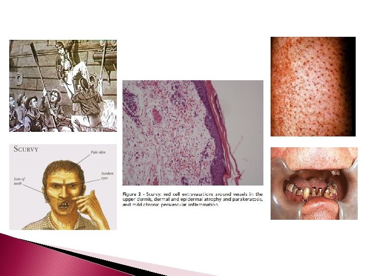 Histopathology � Follicular hyperkeratosis and perifollicular erythrocyte extravasation without an accompanying vasculopathy are characteristic. � Extensive extravasations are usually associated with deposits of hemosiderin within and outside of macrophages. � Most manifestations of scurvy can be attributed to defective collagen synthesis.