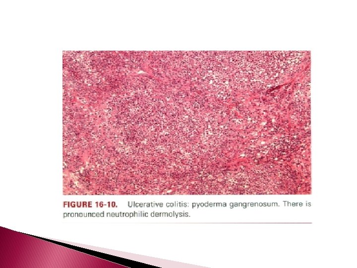 Histopathology � The histology of pyoderma gangrenosum and erythema nodosum is discussed elsewhere. � Cutaneous vasculitis in association with ulcerative colitis includes Ig. A-associated leukocytoclastic vasculitis and benign cutaneous polyarteritis nodosa. �A pauci-inflammatory thrombogenic vasculopathy involving vessels throughout the dermis and subcutis characterizes the histomorphology of associated lupus anticoagulant and/or cryofibrinogenemia.