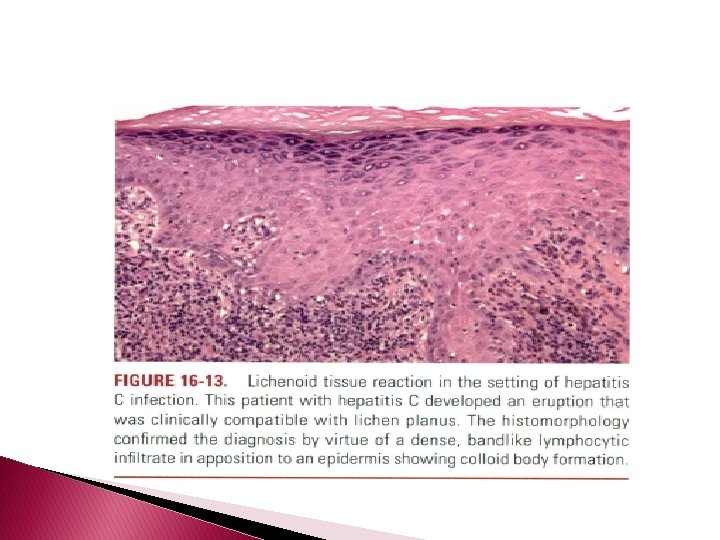 � the skin lesions of hepatitis C can be classified by the dominant reaction pattern, the most common being vasculopathies of neutrophilic and lymphocytic vasculitis and pauci-inflammatory subtypes; palisading granulomatoun inflammation; sterile neutrophilic folliculitis; neutrophilic lobular panniculitis; benign cutaneous polyarteritis nodosa; neutrophilic dermatoses including neutrophilic urticaria and pyoderma gangrenosum; and interface dermatitis