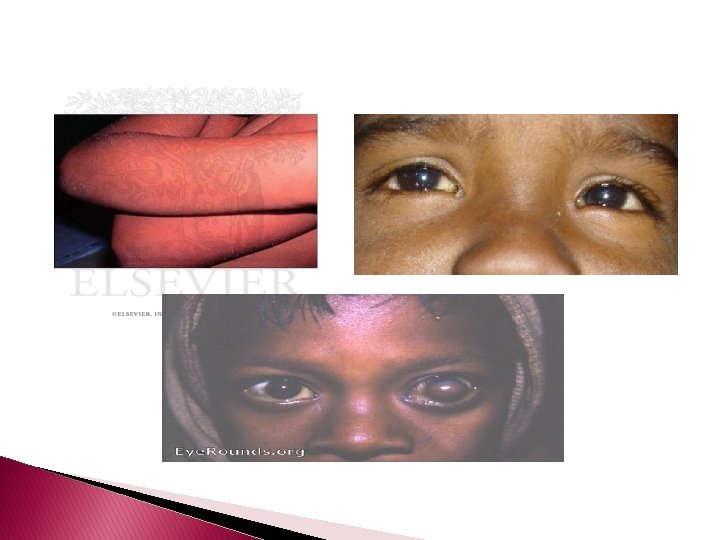 Kwashiorkor � � � Kwashiorkor is a form of protein malnutrition coupled to carbohydrate excess resulting in reduction of a patient's weight by 20% to 40%. Primary manifestations include generalized hypopigmentation that begins circumorally and in the pretibial regions. With disease progression, hyperpigmented plaques with a waxy texture develop over the elbows and ankles and in the intertriginous areas. Dryness, desquamation, and decreased skin elasticity occur. “ Crazy pavement" or "Aaky-paint dermatosis“ describes the extensive desquamation with erosions and fissuring, vesicles, and bullae that may be seen in severe cases. Prominent edema can mask the underlying muscle and subcutaneous tissue atrophy. Hair abnormalities include a diffuse alopecia, alternating bands of normal and hypo pigmented hair referred to as the "flag" sign, and an unusual reddish-brown discoloration called hypochromotrichia. Extracutaneous manifestations include cerebral atrophy secondary to loss of myelin lipid , diarrhea, hepatic steatosis, and mucosal abnormalities such as a smooth tongue, angular stomatitis, and perianal and nasal erosions.