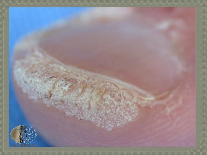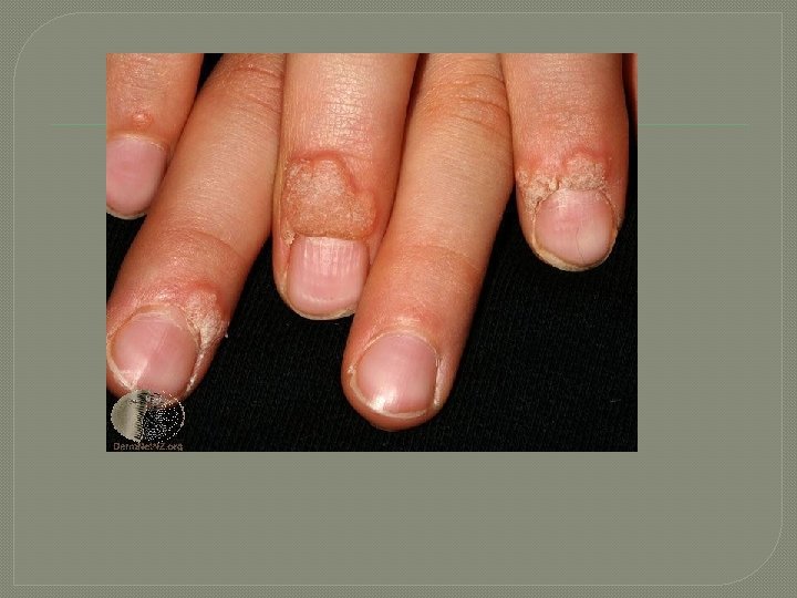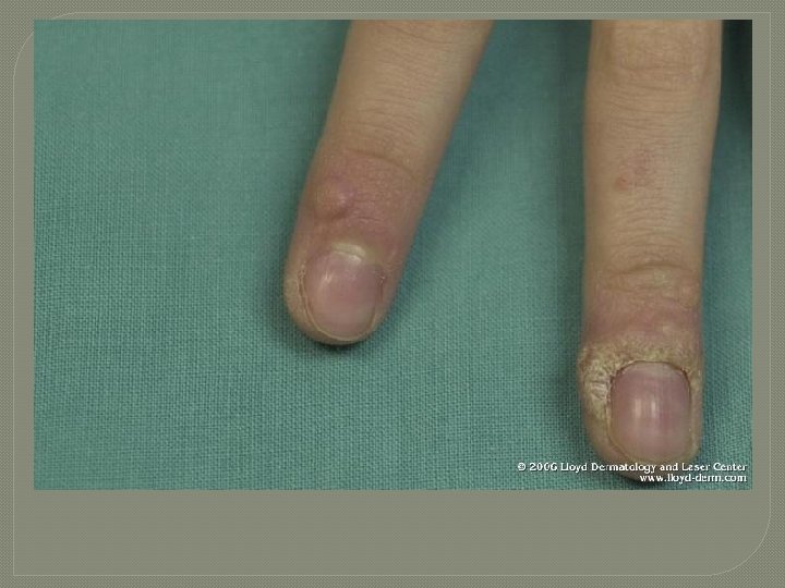 along the perionychial folds, or on the plantar surfaces of the feet.