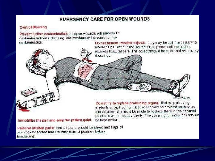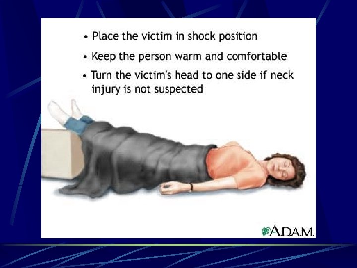 Caring for Shock Have victim lie down, elevate legs about 12” (unless you suspect head, neck, back injuries) Call 9 -1 -1 Control any external bleeding Help victim maintain body temperature Do not give food or drink Reassure victim