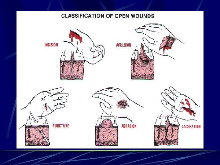 Types of Wounds Contusion (bruise) Abrasion (scrape) Incision (cut / laceration) Avulsion Puncture