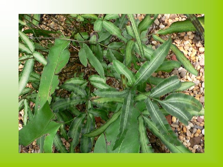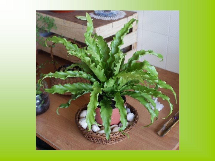 Asplenium nidus avis Engleski naziv: Bird’s nest fern Etimologija: ''gnezdo'' - zimzelena biljka - visina 1 - 1. 75 m (u sobnim uslovima obično oko 0. 5 m) - listovi - celog oboda, gotovo sedeći, tanki, čvrsti, formiraju rozetu Spoljašnji listovi odumiru - iseći ih.