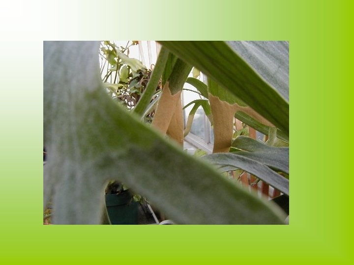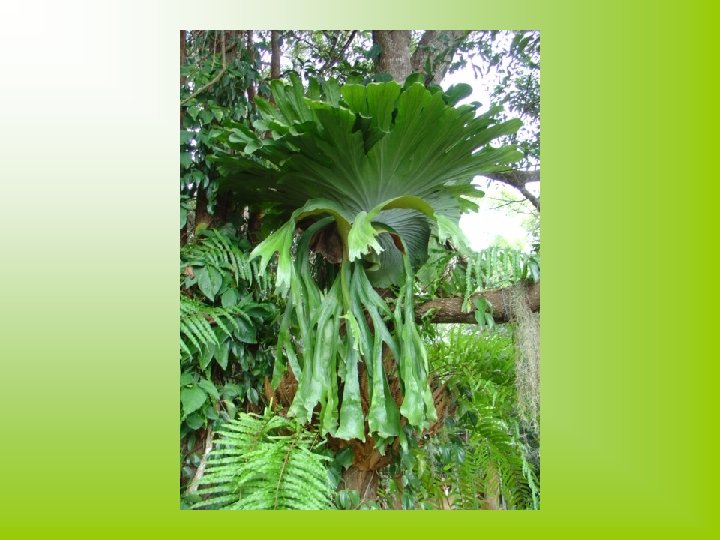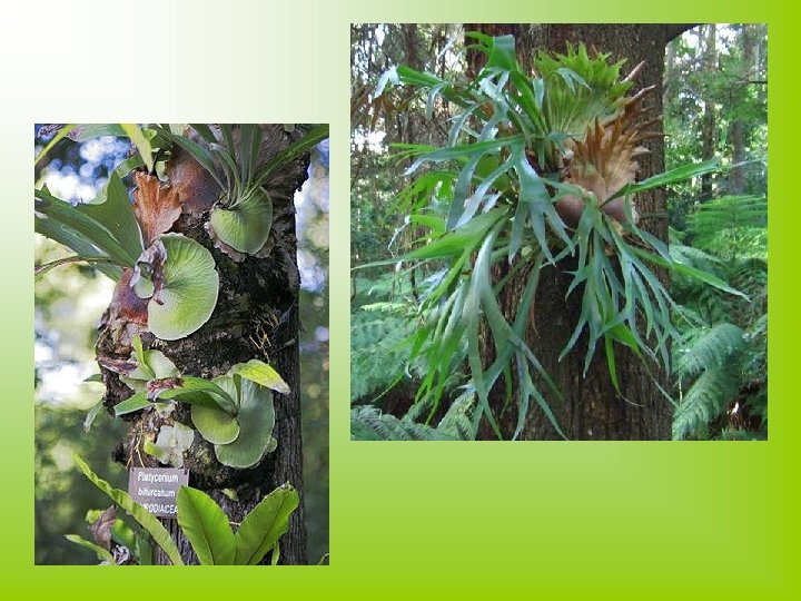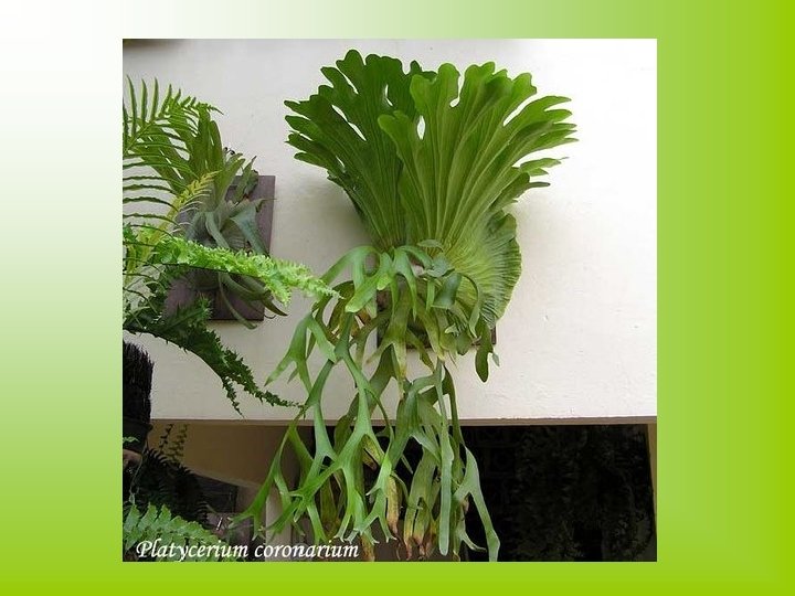 Rod Platycerium Engleski naziv: staghorn ferns -U prirodi - epifite - Ime - grčki ''platy'' - prostran, širok, i ''keras'' - rogat. - srpski naziv - ''jelenji rogovi'' - rod - 18 vrsta - rastu u tropskim predelima Afrike i Azije, - dva tipa listova - ''zaštitni'' - porozni, neupadljivi - pričvršćuju biljku za podlogu (račve grana) - manji i okruglasti ili uspravni, krupni, duboko režnjeviti - nemaju spore - u početku su zeleni, kasnije potamne - u donjem delu - štitasto ispupčeni u udubljenju sakupljaju vodu i hranljive materije.