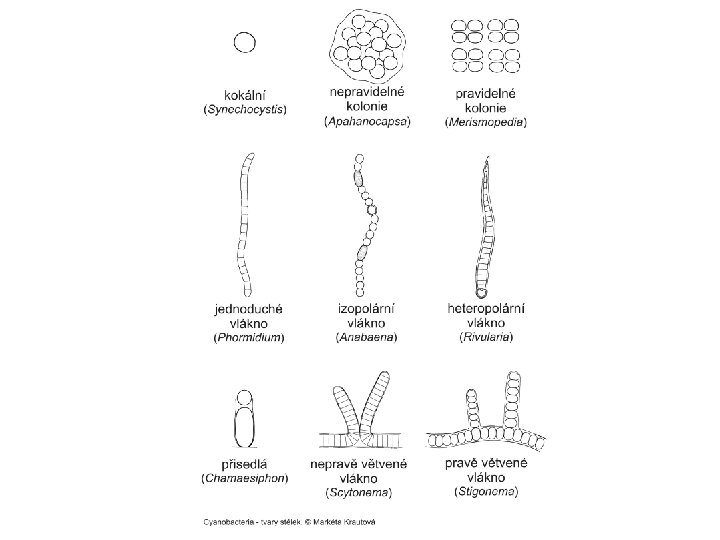 Odd. : Cyanophyta/Cyanobacteria Třída: Cyanophyceae Řád: Nostocales, Nostoc sp. slizové obaly heterocyt vegetativní vlákno Nostoc sp.