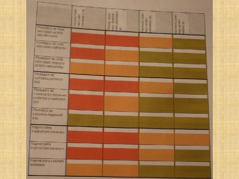 VYHODNOCENÍ DOCHOVANOSTI KRAJINNÉHO RÁZU Hodnocení INDIVIDUÁLNÍ – konkrétní pohledově uzavřené prostory Vymezení nadřazených krajinářských celků Základní krajinářské celky (ZKC) – člověk rozezná jednotlivé krajinné prvky max. na 2 km ZKC – kategorie dochovanosti krajinného rázu Výjimečně dochovaný KR………všechny typické znaky (hlavní i vedlejší) Dobře dochovaný KR…………. . všechny hl. typické znaky, většina vedl. Částečně dochovaný KR………podst. část hl. znaků, vedl. silně setřeny Málo dochovaný KR……………. většina hl. znaků silně setřena, obtížná obnova
