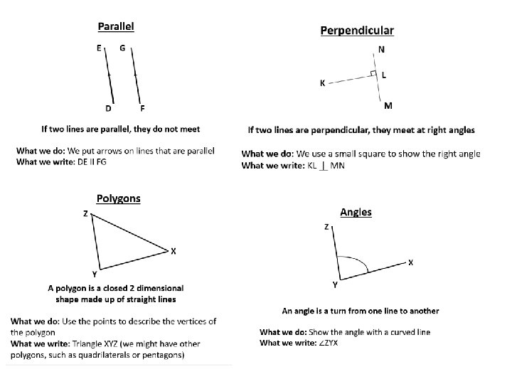Perpendicular N K L M If two lines are perpendicular, they meet at right angles What we do: We use a small square to show the right angle What we write: KL | MN
