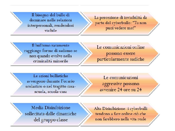FLAMING : Messaggi violenti e volgari mirati a suscitare una lite online. MOLESTIE: invio ripetuto di messaggi offensivi, scortesi ed insultanti. CYBER-PERSECUZIONE : invio ripetuto di messaggi contenenti minacce o fortemente intimidatori. DENIGRAZIONE : sparlare di qualcuno online. Inviare o pubblicare pettegolezzi, dicerie crudeli o foto compromettenti per danneggiare la reputazione della vittima o le amicizie.
