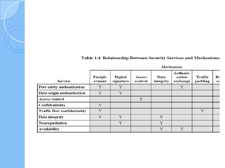 Security Mechanisms (X. 800) specific security mechanisms: ◦ encipherment, digital signatures, access controls, data integrity, authentication exchange, traffic padding, routing control, notarization pervasive security mechanisms: ◦ trusted functionality, security labels, event detection, security audit trails, security recovery