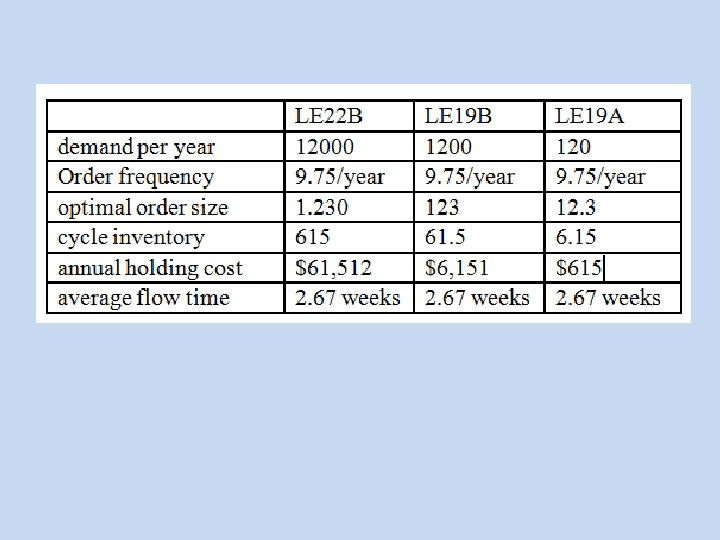 • Annual order cost = 9. 75 x 7000 = $68. 250 • Annual ordering and Holding cost , Across the three sizes = $61, 512 + $6, 151 + $615 + $68. 250 = $136, 528