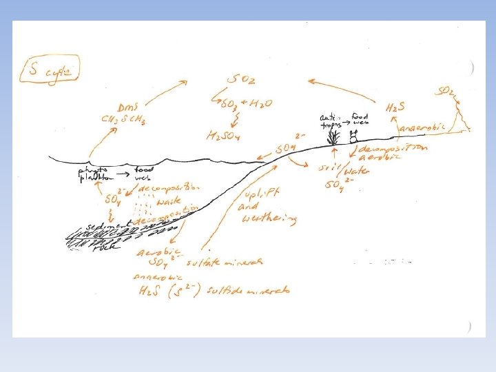 Nitrogen • Combustion NOx + H 20 HNO 3 in atmosphere • Fertilizers- increases N into aquatic ecosystems and causes plant/nutrient pollution (eutrophication) Phosphorus • Fertilizers, detergents- plant/nutrient pollution (eutrophication) Sulfur • • Coal combustion Smelting sulfide minerals Both of which result in Sox exhaust + H 20 H 2 SO 4 AMD