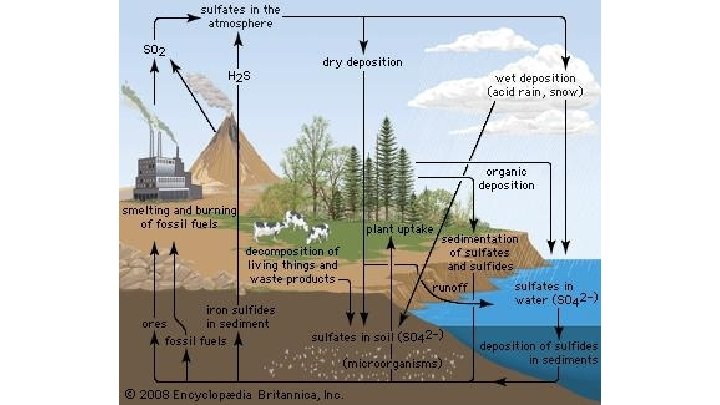Sulfur Cycle ~Most of the earth's sulphur is tied up in rocks and salts or buried deep in the ocean in oceanic sediments. Sulphur can also be found in the atmosphere. It enters the atmosphere through both natural and human sources. Natural, for instance volcanic eruptions, or decaying organisms. ~When sulphur enters the atmosphere through human activity, this is a consequence of industrial processes. . ~All these particles will settle back onto earth, or react with rain and fall back onto earth as acid deposition. ~The particles will than be absorbed by plants and are released back into the atmosphere, so that the sulphur cycle will start over again. ~Plants absorb sulphur when it is dissolved in water. Animals consume these plants, so that they take up enough sulphur to maintain their health.