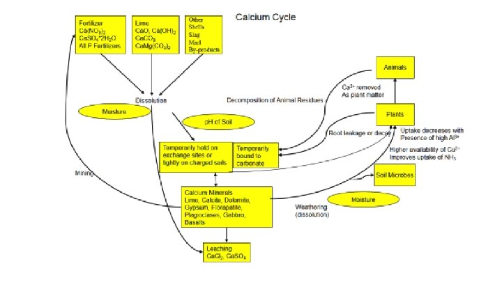 Calcium Cycle: - Calcium is primarily present as rock, minerals, or as structural calcium built into mineral crystal lattices of soil particles and is not readily available. Calcium can also be added as fertilizer, lime or by-products. Water can carry calcium into the soil through weathering and natural dissolution.
