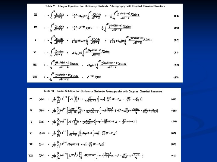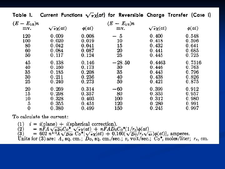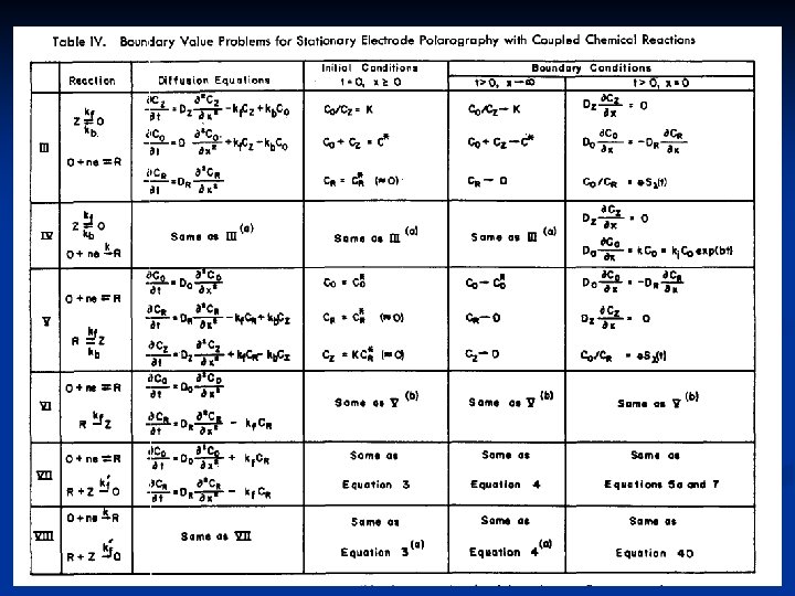 Problem There is no analytical solution to Fick’s second law when the boundary is time dependent. Sevick and Randles solutions was to approximate the integral with a series. While this works for the reversible case, it is not very pragmatic for more complex mechanisms. New Solution: Wait for a high speed computer (IBM main frame -1964 University of Wisconsin at Madison) Nicholson and Shain, “Theory of Stationary Electrode Polarography”, Analytical Chemistry, 36, 706 (1964)