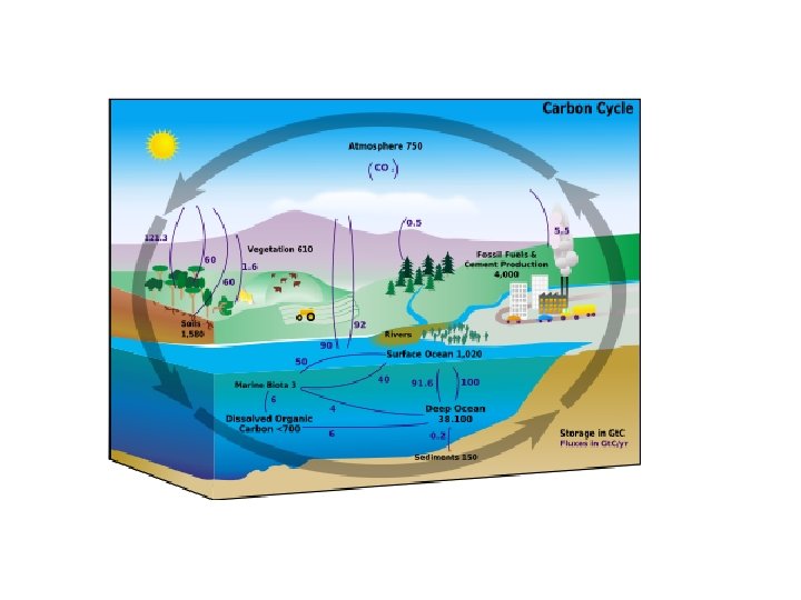 Carbon Cycle The cycle is usually thought of as four major reservoirs of carbon interconnected by pathways of exchange. These reservoirs are: • The atmosphere. • The terrestrial biosphere, which is usually defined to include fresh water systems and non-living organic material, such as soil carbon. • The oceans, including dissolved inorganic carbon and living and non-living marine biota, • The sediments including fossil fuels