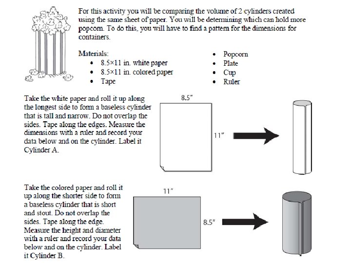 Popcorn Cylinders Anyone? Students: • Work with your assigned partner Materials: • Bag of popcorn, two papers, and rulers Work at your table: With your assigned partner, work together on the Popcorn Cylinder Activity. Follow the instruction on the worksheet.