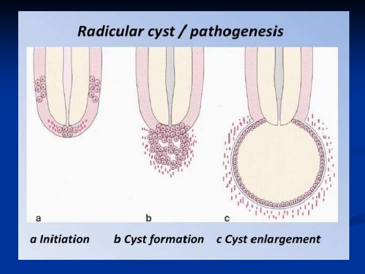 Expansion of radicular cyst Hydrostatic pressure of the cyst fluid increased due to hypertonic content n Water drawn into the cyst cavity along this osmotic gradient n Cyst expansion n Bone resorption n
