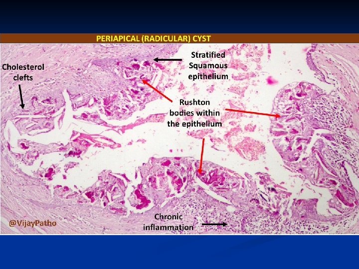 Radicular cyst-histology Arise from proliferation of the rests of Malassez within chronic periapical granulomas n Lined by non-keratinizing squamous epithelium n Supported by a chronically inflammed capsule n Capsule may contain collections of cholesterols n Hypertonic content: breakdown products, n