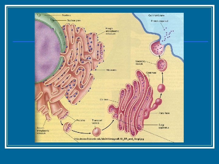 Types of Endoplasmic Reticulum n Rough Endoplasmic Reticulum (RER) n Directly attached to the nucleus (allows for movement of molecules between the two n n m. RNA can move directly to the ribosomes on the ER to make proteins Has ribosomes on it; makes it appear “rough” Makes proteins Smooth Endoplasmic Reticulum (SER) n n n No ribosomes Makes lipids (steroids hormones) and oils Detoxification of harmful chemicals