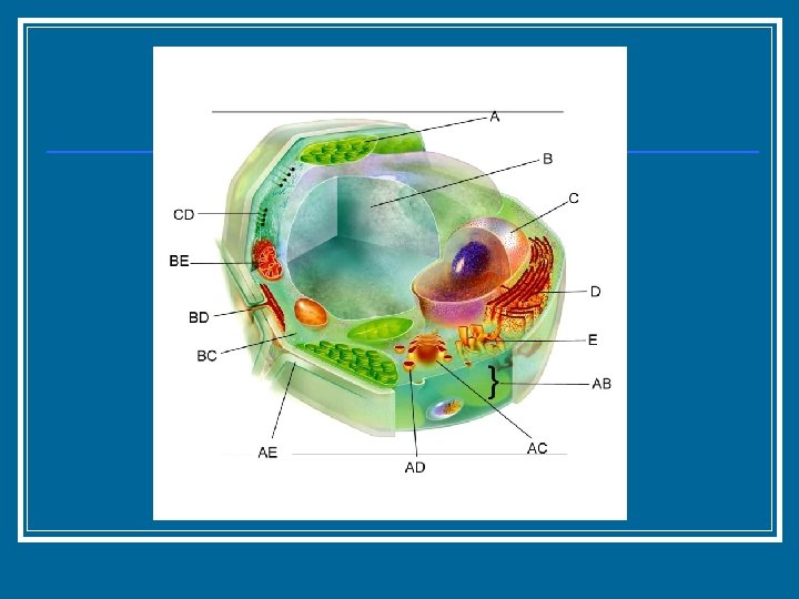 Plant Cell Organelles n Cell wall n n n Central vacuole n n Outer most covering; made of cellulose and chitin Some bacteria, protists, and fungi also have these Water filled pocket in cell Controls rigidity of the plant and stores nutrients and wastes Can make up to 90% of the cell’s volume Chloroplast n n Plastid that is the site of photosynthesis Contains chlorophyll (green pigment)