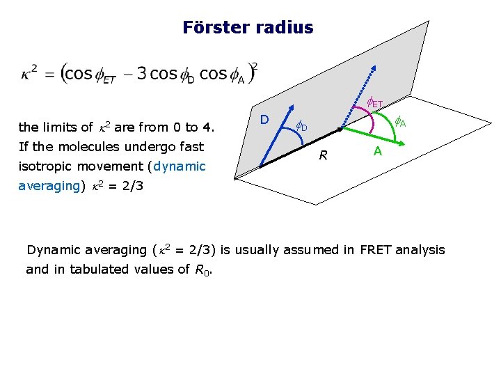 Förster radius f. ET the limits of k 2 are from 0 to 4. If the molecules undergo fast isotropic movement (dynamic D f. A f. D R A averaging) k 2 = 2/3 Dynamic averaging (k 2 = 2/3) is usually assumed in FRET analysis and in tabulated values of R 0.