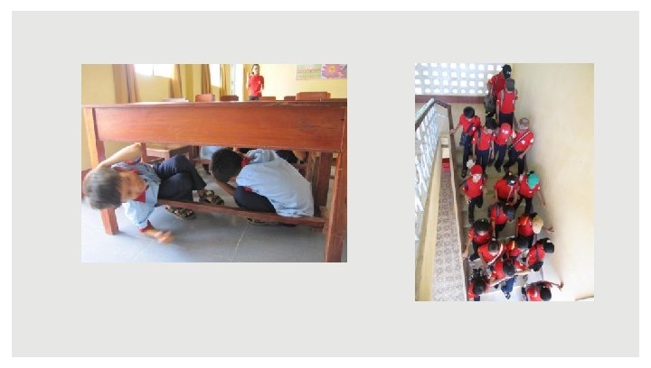 ĐỘNG ĐẤT - NHỮNG VIỆC CẦN LÀM Trong khi có động đất • Nếu ở trong nhà, hãy tìm đến những nơi an toàn (trong phạm vi vài bước chân) • Chui xuống gầm bàn, tay giữ chặt lấy chân bàn. Đảm bảo đầu và cổ được bàn che phủ • Tránh xa các vật bằng kính, đồ điện • Không sử dụng thang máy • Nếu đang ở bên ngoài, nhanh chóng tránh xa nhà cao tầng, cây cối, đường dây điện. Ngồi sụp xuống, hai tay che đầu và giữ chặt. • Nếu bị mắc kẹt dưới đống đổ nát, không di chuyển, che miệng bằng khăn hay quần áo để tránh bụi. Gõ vào tường hoặc vật có thể phát ra âm thanh để cứu hộ có thể tìm ra. 92