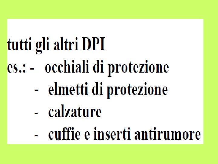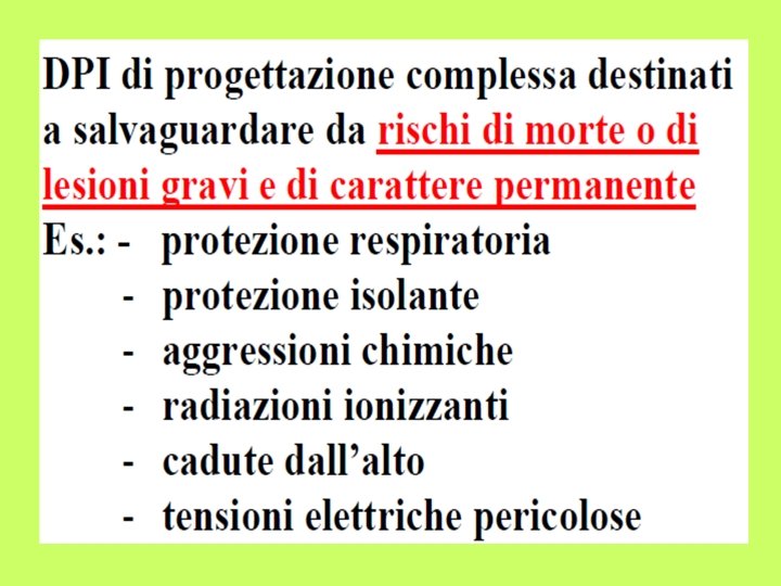 D P I DISPOSITIVI DI PROTEZIONE INDIVIDUALE Ing Slides: 68 Download presentation D. P. I. DISPOSITIVI DI PROTEZIONE INDIVIDUALE Ing. Giuseppe ABBA I RISCHI VANNO EVITATI O RIDOTTI CON: MISURE DI PROTEZIONE COLLETTIVA ESEMPIO MACCHINE O ATTREZZATURE PIU’ SICURE O MENO RUMOROSE MISURE DI PROTEZIONE COLLETTIVA ESEMPIO SCHERMATURA INSONORIZZANTE DI UN REPARTO DI LAVORAZIONE CON UNA MACCHINAMOLTO RUMOROSA OVE IMPOSSIBILE ELIMINARE COMPLETAMENTE I RISCHI E’ NECESSARIO UTILIZZARE I D. P. I. SE LA VALUTAZIONE DEI RISCHI NE EVIDENZIA LA NECESSITA’ IL DATORE DI LAVORO LI DEVE FORNIRE AI LAVORATORI I LAVORATORI HANNO L’OBBLIG O DI DPI DI PRIMA CATEGORIA ALCUNI ESEMPI DI DPI MASCHERINE GUANTI GUANTI PER PROTEZIONE: - MECCANICHE -DA AGENTI CLIMICI - ECC. OCCHIALI VISIERE MASCHERE PER SALDATURA D. P. I. CONTRO LE CADUTE DALL’ALTO IMBRAGATURE RISCHIO RUMORE PROTEZIONE DELL’UDITO Lex LIVELLO ESPOSIZIONE PERSONALE AL RUMORE Lex < 80 d. B(A) NESSUN OBBLIGO DI FORNITURA E UTILIZZO DEI DPI-u 80 ≤ Lex < 85 d. B(A) - i DPI-u devono essere forniti ai lavoratori - i lavoratori possono decidere se utilizzarli o no - i DPI-u devono essere forniti ai lavoratori che hanno l’obbligo di usarli ESEMPI D. P. I. PER PROTEZIONE DELL’UDITO D. P. I. PROTEZIONE DEI PIEDI SCARPE ANTINFORTUNISTICHE SCARPE ANTINFORTUNISTICHE - PROTEZIONE DA CADUTA OGGETTI - ANTISCIVOLAMENTO - PROTEZIONE DA FORATURE CASCHI ED ELMETTI PROTEZIONE DEL CAPO COLORI DEL CASCO NON CODIFICATI DALLA NORMATIVA NEI GRANDI CANTIERI CI POSSONO ESSERE REGOLE SPECIFICHE PREPOSTO AI LAVORI: ROSSO OPERATORE ABILITATO: GIALLO PERSONALE AUSILIARIO: BIANCO GRAZIE PER L’ATTENZIONE ….
