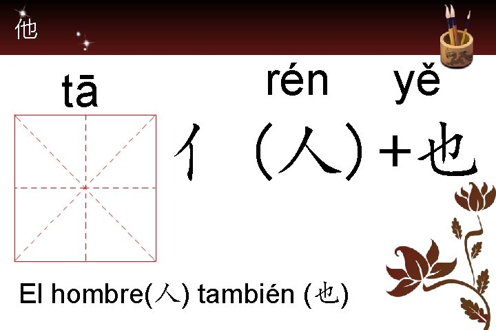 她(Pron. ) ella tā nǚ yě 女+也 La mujer (女) también (也)
