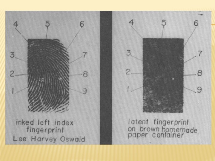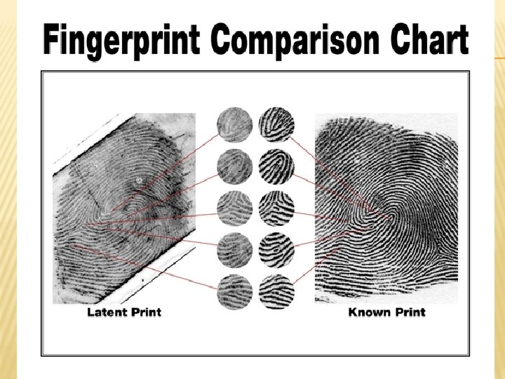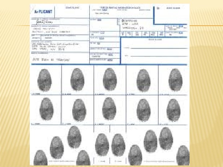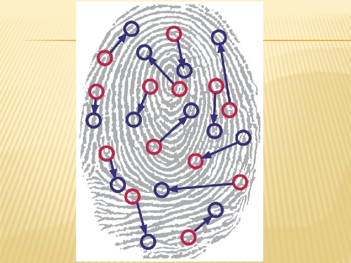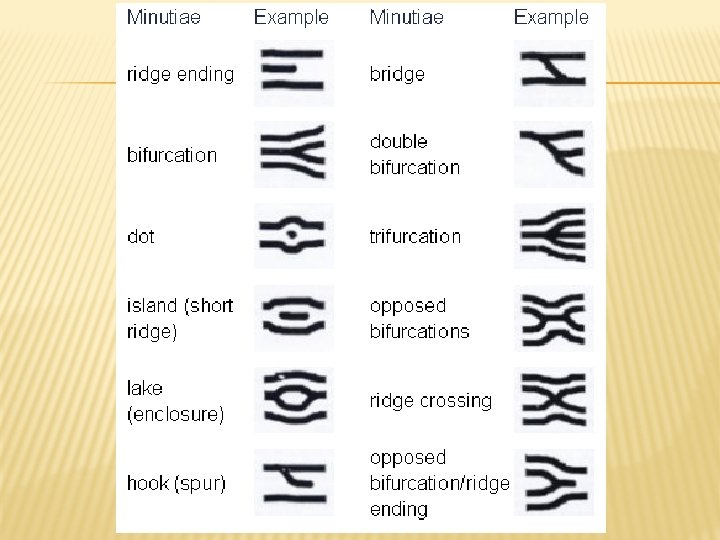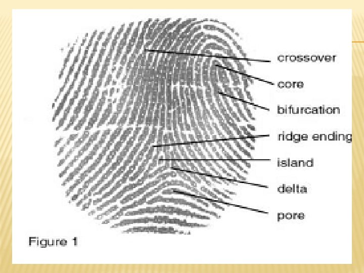Ridge Classification Individual ridge characteristics are called minutiae. No legal requirements in the US regarding the number of points that must match before deciding that a fingerprint belongs to a certain individual. Criminal courts generally accept 8 -12 points of similarity.