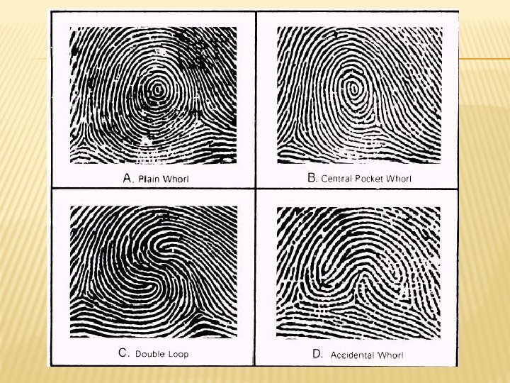 3 Basic Patterns: 2. Whorl; at least two deltas and a core 4 types: a. Plain whorl b. Central pocket c. Double d. Accidental