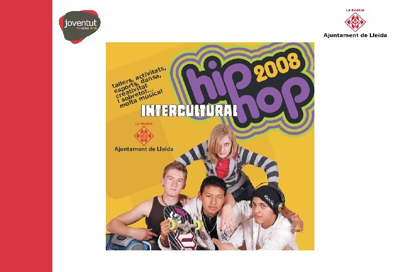 Descripció del projecte: • Hip Hop Intercultural és un projecte d'integració social de joves d’origen immigrant a través d'activitats de lleure participatiu. • Utilitza la cultura Hip Hop i altres activitats procedents de la cultura urbana com a elements facilitadors de la intervenció social amb grups de joves que utilitzen l’espai públic com a lloc de trobada i de relació. • Els dos eixos temàtics són la música (SONA BÉ) i l’esport (LLEURESPORT). • El projecte consisteix en diferents programacions d'activitats de lleure obertes a tota la població juvenil de la ciutat. Es busca intencionadament la participació de joves immigrants mitjançant la intervenció i mediació de professionals (educadors socials) que fan contactes amb aquests joves als seus punts de trobada al carrer i als centres educatius.