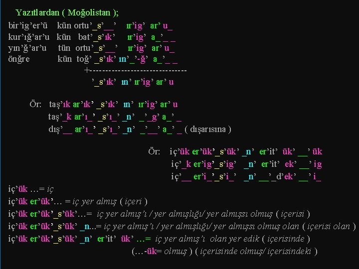 İsmin -de hali/ durumu; -de durumu; içeri_ iç’ük’er…ük ( içkerig ) ( iç’ik/-g-ğ-y-i yer alık ) içeride_ iç’ük’er…it’ük ( içkeriteg ) ( iç’ik/-g-ğ-y-i yer edik ) içerideki_ iç’ük’er…it’ük’ük ( içkeritekig ) ( iç’ik/-g-ğ-y-i yer edik bulunmuş/ olmuş…) ‘ İçerideki adam_ içi yer edik bulunmuş adam’ 71