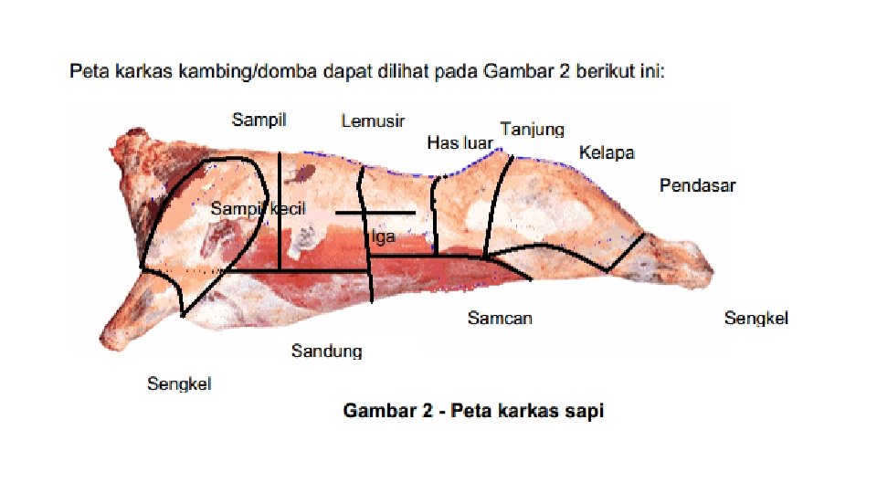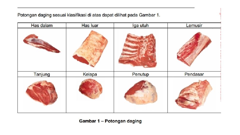 Definisi • Urat daging (otot) yang melekat pada • kerangka kecuali urat daging bagian bibir, • hidung dan telinga yang berasal dari hewan • yang sehat sewaktu disembelih. • Menurut FAO: • Idem + cukup umur untuk dipotong