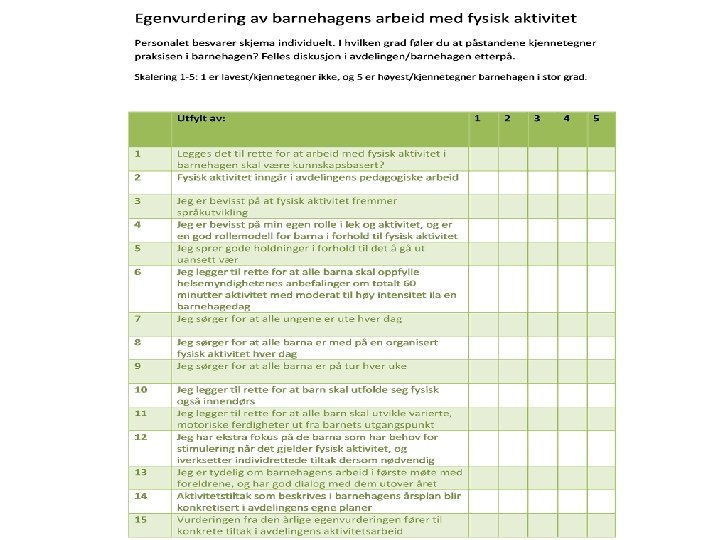 Mål • Alle barn skal oppfylle Helsedirektoratets anbefalinger om fysisk aktivitet • Lage en modell for oppfølging av fysisk aktivitet som kan brukes i alle barnehagene