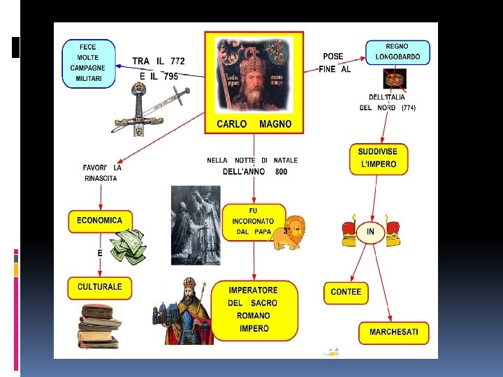 I rapporti con la chiesa Generalmente, i re franchi si presentavano come naturali difensori della Chiesa cattolica, avendo restituito al pontefice ai tempi di Pipino quei territori dell'Esarcato di Ravenna e della Pentapoli che per concezione comune erano creduti appartenenti al Patrimonio di San Pietro. Carlo sapeva bene che al Papa importava soprattutto ritagliare un sicuro territorio di sua pertinenza in Italia Centrale, libero da altri poteri temporali, compreso quello bizantino , nella messa di Natale del 25 dicembre 800 a Roma fu incoronato imperatore del SACRO ROMANO IMPERO