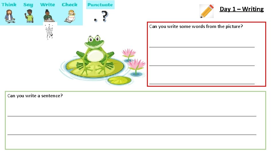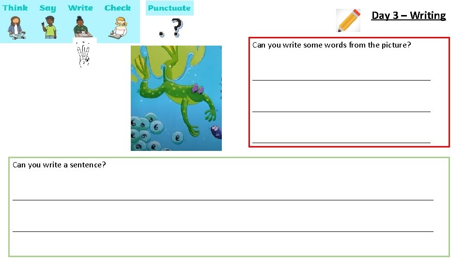 Day 1 – Reading Read ‘The Teeny Weeny Tadpole’. If you don’t have a copy of the story at home you can use the link below. https: //www. youtube. com/watch? v=DFzqv. He. XXQw