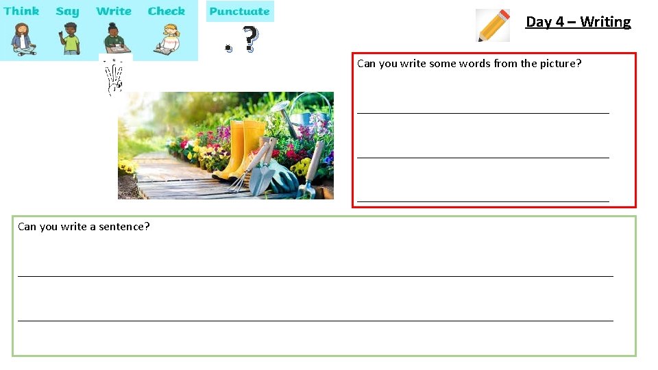 . ? Which mini beast is your favourite? Why? Day 2 – Writing Can you list some mini beasts? _________________________________________ Can you write a sentence about one of them? _________________________________________________________________________________________________