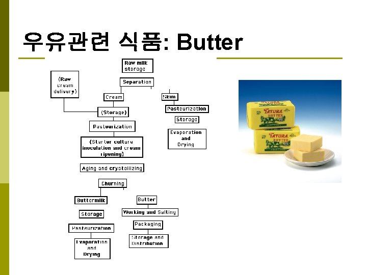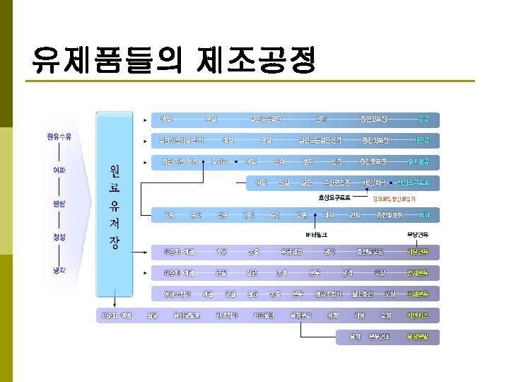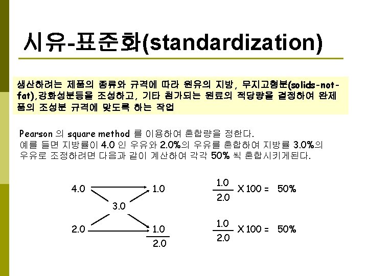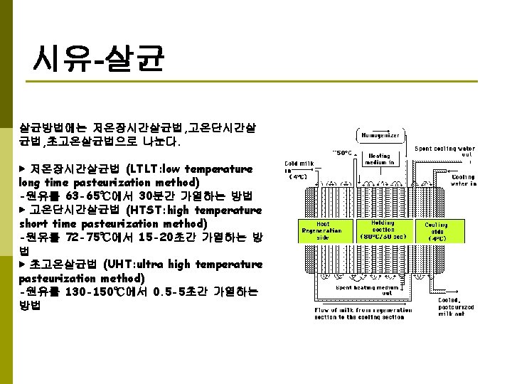 시유 (market milk) Measurement Inspection Clarification Standardiza표준화 tion Distribution Inspection Storage (Aging) Packaging Homogenization Pasteurization