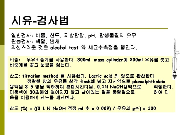 시유-검사법 지방함량 측정 : babcock milk test 1. Measure milk into graduated test tube. You usually take 18 grams of milk or 17. 6 milliliters. 2. Add 17. 6 milliliters of 90 -92% sulfuric acid. 3. Centrifuge at 50ºC. 4. Measure fat which will be floating on top of liquid in the test tube 우유의 열안정성과 신선도 판단: alcohol test 1. 2. 3. 4. 5 ml milk into testtube 5 ml of ethyl alcohol (68%) and mix Coagulation means acidity is over 0. 21% Test should be carried out below than 15 C