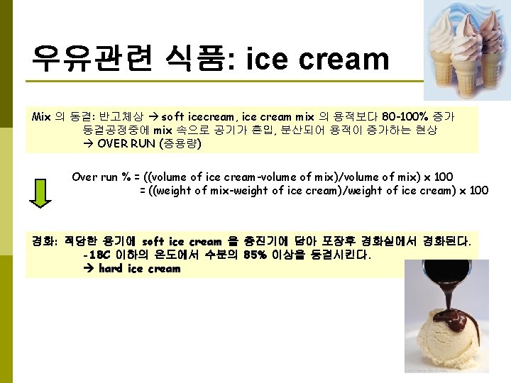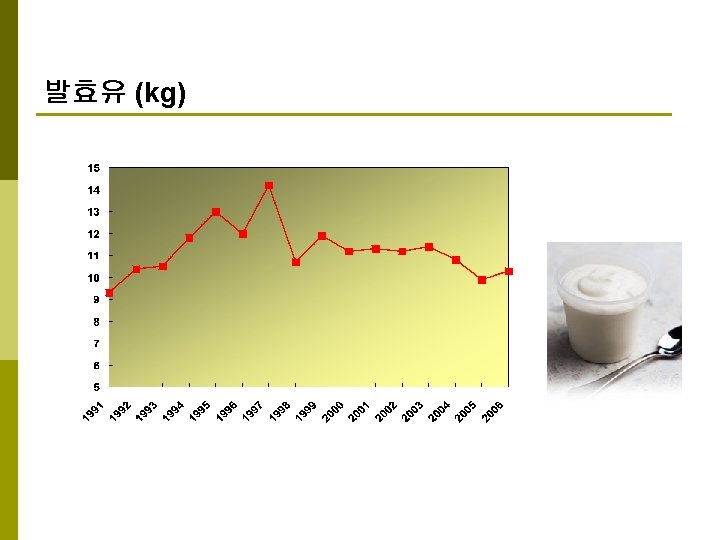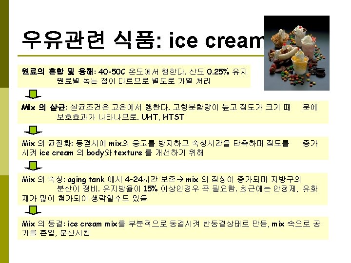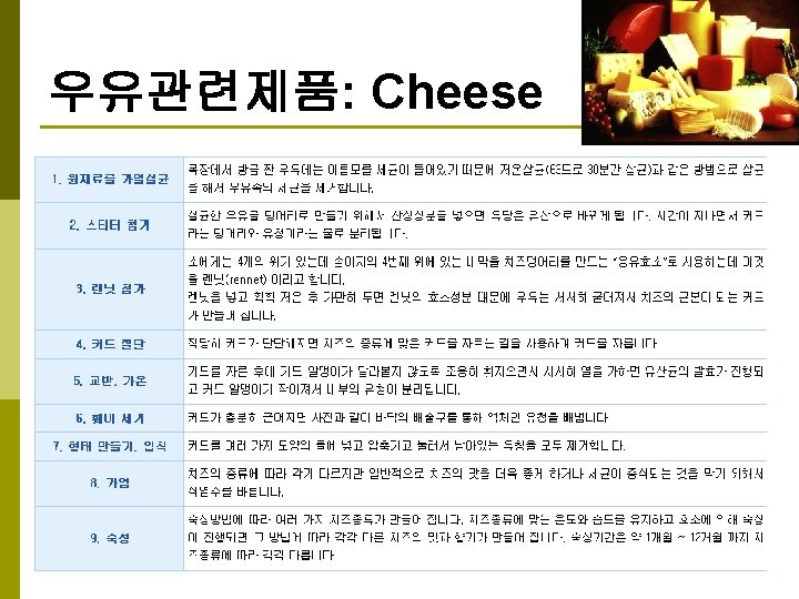 발효유-고형요구르트 원료의 처리: 탈지유를 원료로 12 -15% 고형분 gelatin, agar (thickening agent) 0. 1 -0. 5% Vitamin, sugar, syrup 90 C, 20 -30 min. 94 C, 15 min. 115 C, 1 min. cooling 접종, 배양: 별도로 배양된 starter 를 원료액에 대해 2 -3% 첨가후 교반 Starter: Str. Lactis, Str. Cremoris Lactobacillus bulgaricus, L. acidophilus Curd 형성 0. 85 -0. 95 (p. H 4. 4 -4. 5) 형성 (*활성균주는 더 빠름) 충진, 냉각: