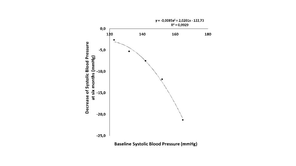 Reduction of Systolic Blood Pressure n Baseline Six months p Δ 164. 7± 7. 5 143. 3± 8. 5 *** -21. 3± 9. 4 Group 1 (>160) 27 Group 2 (150 -159) 35 152. 1± 2. 9 140. 3± 6. 4 ** -11. 8± 6. 9 Group 3 (140 -149) 70 141. 9± 2. 5 134. 4± 6. 4 *** -7. 5± 6. 2 Group 4 (130 -139) 89 131. 9± 2. 5 126. 6± 5. 0 *** -5. 3± 5. 4 Group 5 (120 -129) 75 122. 7± 2. 9 120. 1± 4. 3 *** -2. 6± 4. 3 *P<0. 05; ** P<0. 001; *** P<0. 0001