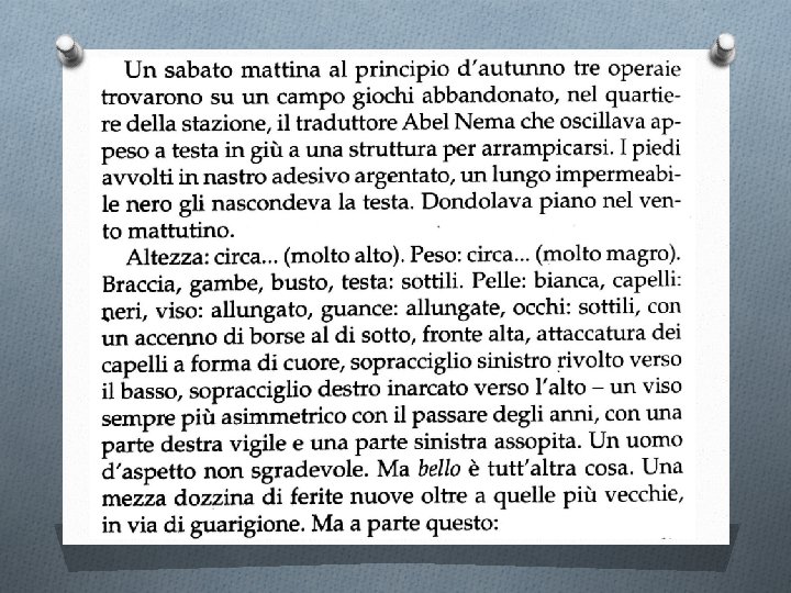 L’impostazione del romanzo O Abel Nema: nome parlante per un protagonista ‘poliglotta’ e ‘muto’ (ma nemec = tedesco) O Perché il protagonista non parla (o parla pochissimo)? Chi parla in vece sua? O Che valenza c’è nel gesto del narratore di raccogliere le parole altrui intorno e su un protagonista che non parla? O Che valenza c’è nel gesto del protagonista di subire la violenza altrui senza parlare? O La violenza si esercita su chi non può prendere la parola: tutti i giorni