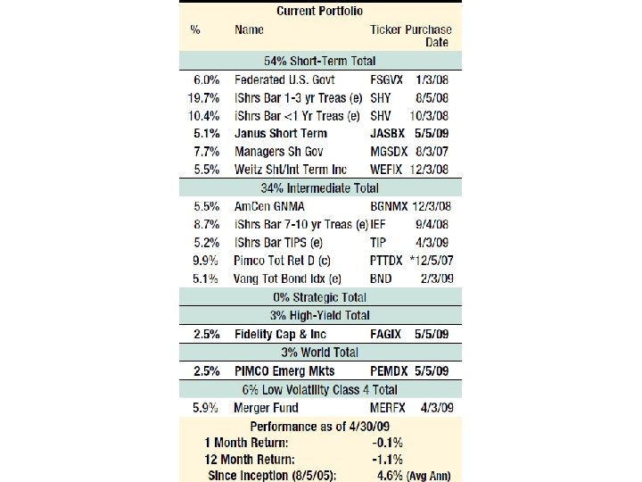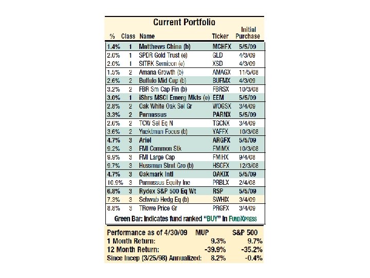 Risk Classification and Portfolio Construction /Management Current High Ranking Funds Portfolio Weight Class Type Ticker MUP FUNDX HOTFX 1 China MCHFX /FXI 1. 4% 1. 1% 2. 9% 1 Gold GLD 2% 2. 5% 5. 3% 2 Em Mkts EEM 3% 3. 3% 7. 5% 2 Mid Cap BUFMX/DVLIX 2. 6% 1. 7% 3. 6% 2 TCW select TGCNX 2. 6% 0. 7% 4. 4% 3 Hussman HSGFX 9. 7% 6. 3% 4. 9% 3 Oakmk Intl OAKIX 4. 7% 5. 1% 4. 9% 3 SP 500 Eq RSP 6. 8% 6. 9% 5. 5%