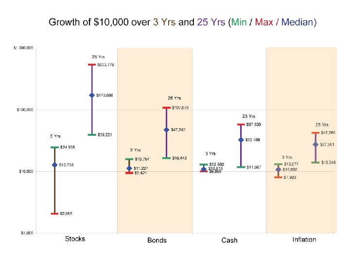 3 Year Investment (1925 -2008) 250. 00% 200. 00% 150. 00% 100. 00% Maximum Minimum Mean 50. 00% Stocks -50. 00% -100. 00% Bonds Cash Inflation