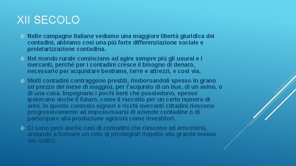 XII SECOLO Nelle campagne italiane vediamo una maggiore libertà giuridica dei contadini, abbiamo così una più forte differenziazione sociale e proletarizzazione contadina. Nel mondo rurale cominciano ad agire sempre più gli usurai e i mercanti, perché per i contadini cresce il bisogno di denaro, necessario per acquistare bestiame, terre e attrezzi, e così via. Molti contadini contraggono prestiti, rimborsandoli spesso in grano (al prezzo del mese di maggio), per l’acquisto di un bue, di un asino, o di una casa. Impegnano i pochi beni che possiedono, spesso ipotecano anche il futuro, come il raccolto per un certo numero di anni. In questo contesto signori e ricchi mercanti cittadini riescono progressivamente ad impossessarsi di aziende contadine o di partecipare alla produzione agricola come investitori. Ci sono però anche casi di contadini che riescono ad arricchirsi, andando a formare un ceto di privilegiati rispetto alla grande massa dei rustici.