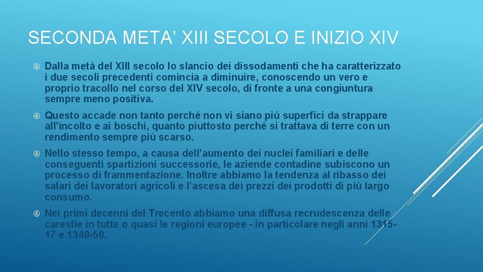 SECONDA META’ XIII SECOLO E INIZIO XIV Dalla metà del XIII secolo lo slancio dei dissodamenti che ha caratterizzato i due secoli precedenti comincia a diminuire, conoscendo un vero e proprio tracollo nel corso del XIV secolo, di fronte a una congiuntura sempre meno positiva. Questo accade non tanto perché non vi siano più superfici da strappare all’incolto e ai boschi, quanto piuttosto perché si trattava di terre con un rendimento sempre più scarso. Nello stesso tempo, a causa dell’aumento dei nuclei familiari e delle conseguenti spartizioni successorie, le aziende contadine subiscono un processo di frammentazione. Inoltre abbiamo la tendenza al ribasso dei salari dei lavoratori agricoli e l’ascesa dei prezzi dei prodotti di più largo consumo. Nei primi decenni del Trecento abbiamo una diffusa recrudescenza delle carestie in tutte o quasi le regioni europee - in particolare negli anni 131517 e 1340 -50.