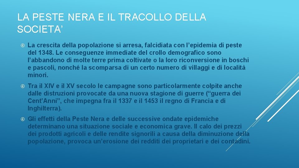 LA PESTE NERA E IL TRACOLLO DELLA SOCIETA’ La crescita della popolazione si arresa, falcidiata con l’epidemia di peste del 1348. Le conseguenze immediate del crollo demografico sono l’abbandono di molte terre prima coltivate o la loro riconversione in boschi e pascoli, nonché la scomparsa di un certo numero di villaggi e di località minori. Tra il XIV e il XV secolo le campagne sono particolarmente colpite anche dalle distruzioni provocate da una nuova stagione di guerre (“guerra dei Cent’Anni”, che impegna fra il 1337 e il 1453 il regno di Francia e di Inghilterra). Gli effetti della Peste Nera e delle successive ondate epidemiche determinano una situazione sociale e economica grave. Il calo dei prezzi dei prodotti agricoli e delle rendite signorili a causa della diminuzione della popolazione, provoca un’erosione dei redditi dei proprietari e dei contadini.