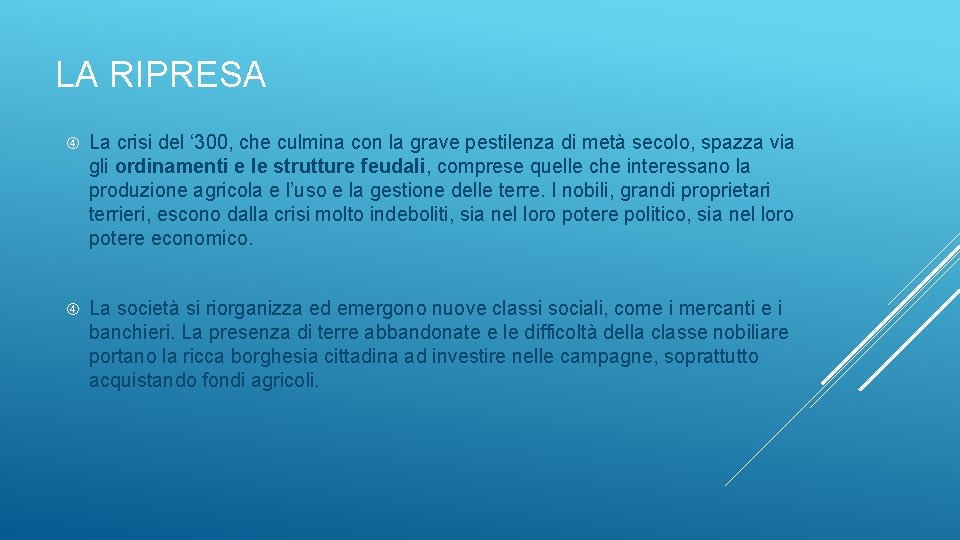 LA RIPRESA La crisi del ‘ 300, che culmina con la grave pestilenza di metà secolo, spazza via gli ordinamenti e le strutture feudali, comprese quelle che interessano la produzione agricola e l’uso e la gestione delle terre. I nobili, grandi proprietari terrieri, escono dalla crisi molto indeboliti, sia nel loro potere politico, sia nel loro potere economico. La società si riorganizza ed emergono nuove classi sociali, come i mercanti e i banchieri. La presenza di terre abbandonate e le difficoltà della classe nobiliare portano la ricca borghesia cittadina ad investire nelle campagne, soprattutto acquistando fondi agricoli.